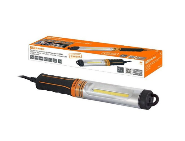 Светильник переносной светодиодный TDM ФП10, COB 6 Вт, 360 лм, 230 В, IP65, сетевой, имеет шнур длиной 5 метров и применяется для местного освещения рабочей зоны: в автомастерских, сервисах, гаражах, подсобных помещениях, а также в мастерских. Мощный светодиод COB для создания равномерного освещения рабочей зоны. Водонепроницаемость IP65 позволяет использовать светильник в помещениях с повышенной влажностью и на улице. Прорезиненная рукоятка предотвращает выскальзывание светильника из рук во время работы. Выдвигаемый крюк для подвешивания. Прочный противоударный корпус из АБС-пластика. Встроенный литий-ионный аккумулятор обеспечит до двух часов непрерывной работы и большую автономность.
