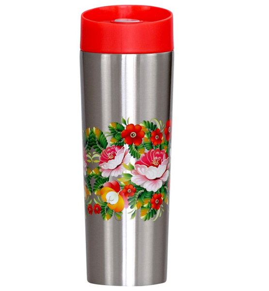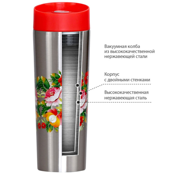 Корпус с двойными стенками из высококачественной нержавеющей стали. Вакуумная колба из высококачественной нержавеющей стали. Крышка из высококачественного пластика на резьбе, с поилкой. Кнопка открывания/закрывания клапана. Оригинальный механизм не допускающий протекания жидкости даже в случае опрокидывания кружки. Противоскользящее покрытие дна, сохраняет температуру в течение 6 часов.