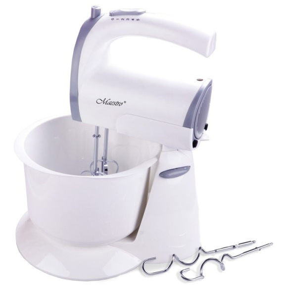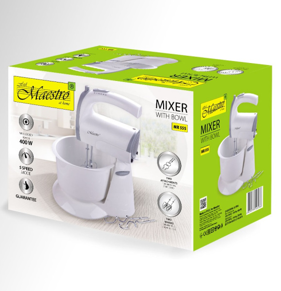 Миксер с чашей MR-555 - предназначен для облегчения женской участи в процессе приготовления пищи. Простой и удобный в использовании электроприбор, который за считанные минуты смешает и взобьет все ингредиенты вашего блюда, а с помощью венчиков для замешивания теста процесс вымешивания будет облегчен до минимума. Еще одним его преимуществом есть то,что это стационарный миксер с вращающейся чашей, Вы можете включить процесс взбивания или замешивания, а сами заниматься другими делами. Если Вам требуется ручной миксер, Вы просто снимаете его с подставки и пользуетесь.