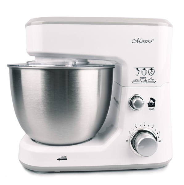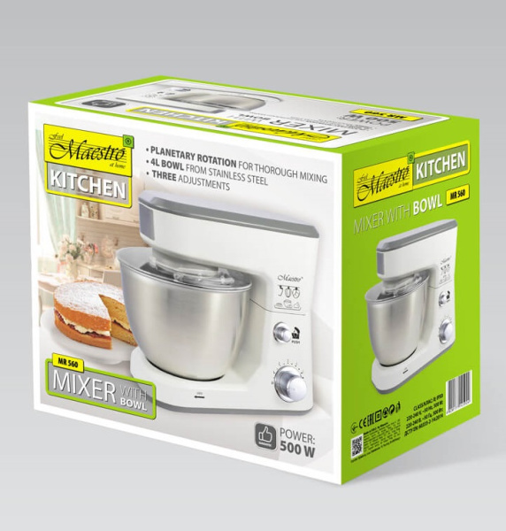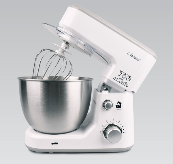 Бытовая техника мощностью 500 Вт имеет 6 уровней скорости с возможностью регулировки, кнопку блокировки для безопасности, а так же кнопочку для опускания и подъёма кронштейна. Материалом для изготовления корпуса послужило сочетание пластика с алюминием. Для удобства в использовании предусмотрена съёмная чаша с планетарным вращением, которое обеспечивает тщательное перемешивание. Выполнена из высококачественной нержавеющей стали. Металл прочный, не выделяет опасных веществ, не поддаётся коррозии и не несёт вреда Вашему здоровью. Крышка со специальным желобком для поочерёдного добавления ингридиента послужит препятствием от всевозможных брызг в процессе работы. Различные насадки в комплекте В комплекте 3 насадки: битер, крюк и венчик. Благодаря их наличию в наборе, Вы сможете не только подготовить тесто для абсолютно любой выпечки, но и взбить суфле, яйца, майонез, крем, мусс и т.д. В уходе не требует специальных моющих средств, можно мыть в посудомоечной машине.