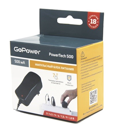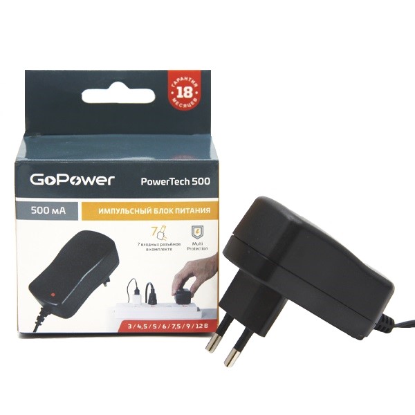 Универсальный импульсный блок питания 500мА. Выходное напряжение устанавливается переключателем: 3,0 / 4,5/ 5,0/ 6,0 / 7,5 / 9,0 / 12,0 В DC, максимальный ток 500 мА, 7 входных разъемов в комплекте: благодаря набору из 7 наиболее распространенных входных разъемов и выбору полярности блоки питания совместимы с большим количеством современных электроприборов и устройств. Технология «Multi Protection»: защита от короткого замыкания и перегрузок, светодиодная индикация.