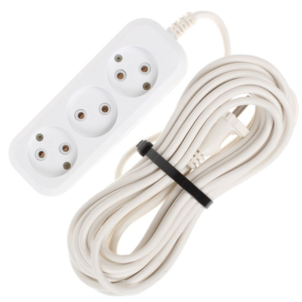 Электрический удлинитель JETT на 3 гнезда без заземления, длиной 7 м представляет собой электротехническое устройство с выносными розетками. Рассчитан на подключение 3 независимых нагрузок общей мощностью 2200 Вт (номинальное значение тока не более 10 А, напряжения 220 В). Предназначен для использования в жилых, бытовых, служебных помещениях в качестве сетевого электроудлинителя. Конструктивно состоит из 2-жильного медного провода сечением 0,75 мм, корпуса белого цвета из пластика АБС, контактов из цветного металла.