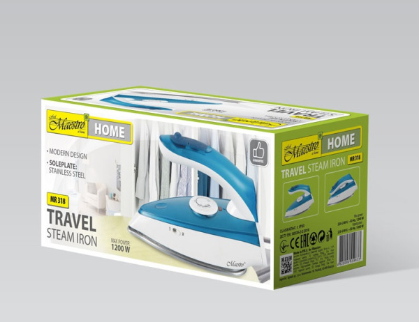 Утюг дорожный MR-318 Maestro оснащён подошвой из нержавеющей стали. Такое основание считается одним из самых популярных. Гладкая поверхность хорошо разглаживает и не боится повреждений механического характера в виде фурнитуры. Складная ручка, вместительность резервуара для воды 80 мл. Основные рабочие режимы: отпаривание и сухое глажение и дополнительная функция: "паровой удар".