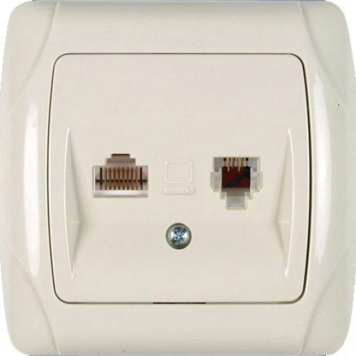 Розетка компьютерная+телефонная 2 входа скрытой проводки. Разъем: 1×RJ11, 4 контакта; 1×RJ45, 8 контактов, 5 категория.