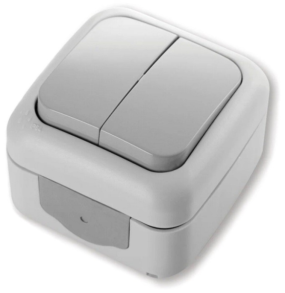 Двухклавишный выключатель Viko Palmiye IP54 накладной, цвет серый, в сборе. Предназначен для сетей до 250 В на ток до 10 А. Выключатель влагозащищенный, соответствует классу защиты IP54. Это означает, что он обладает защитой от накопления пыли и от брызг воды. Подходит для установки на открытых балконах и в санузлах. Пыль может проникать в корпус в незначительном количестве, не препятствующем нормальной работе оборудования. Полная защита от прикосновения к токоведущим частям выключателя и от проникновения твердых предметов.