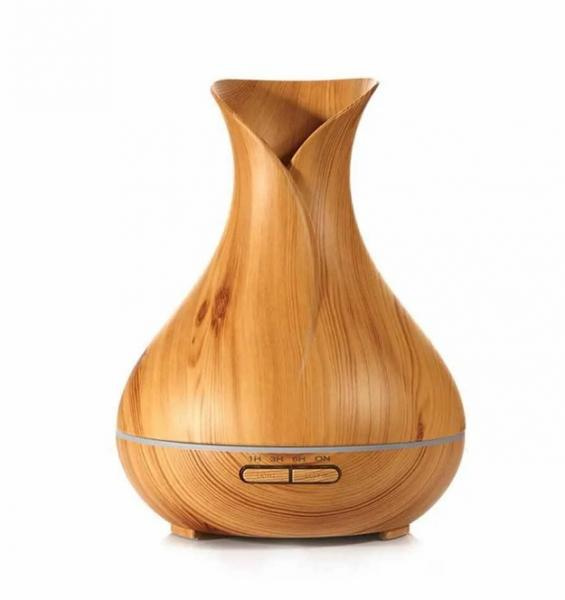 Увлажнитель воздуха ваза сLED подсветкой покрытый древесным зерном, использует новейшую ультразвуковую технологию и использует успокаивающую ароматерапию, чтобы дать гладкий туман для смягчения и увлажнения сухого воздуха.