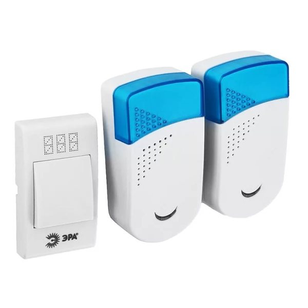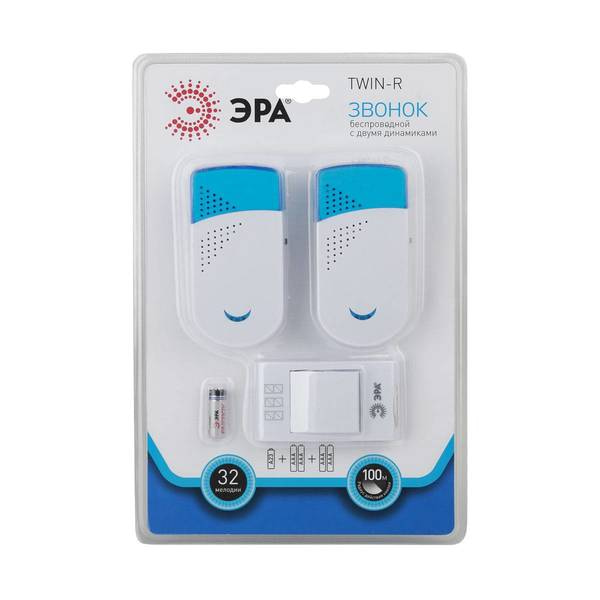 Беспроводной звонок ЭРА TWIN-R Б0019878 - дверной беспроводной электронный звонок с двумя динамиками, которые можно установить в разных комнатах. Идеальное решение для больших квартир, частных домов. Радиус действия 100 метров. 32 мелодии можно чередовать в зависимости от настроения. Звук такого звонка никогда не надоест. Работает от батареек: -1 шт А23 для кнопки (входят в комплект), - по 2 шт ААА мизинчиковые для каждого динамика (в комплект не входят). Аккуратный лаконичный дизайн. Над кнопкой предусмотрено пространство для указания номера квартиры. Не требует специального монтажа - крепится на двусторонний скотч или на шурупы.