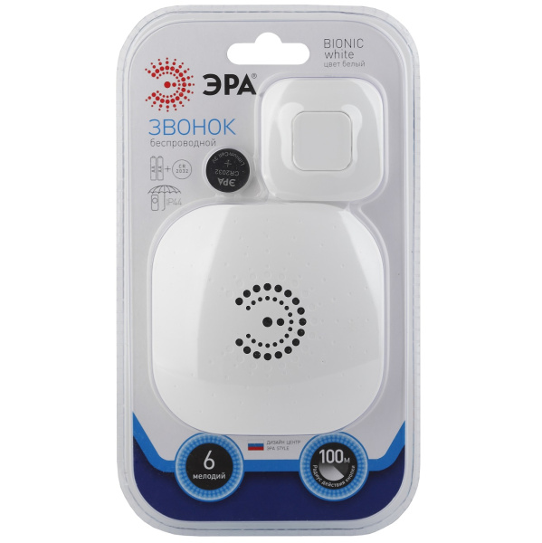 Звонок дверной Bionic – хорошее устройство с уникальным эргономичным дизайном, которое подходит для применения как основного оповещения, так и прибора внутреннего вызова. Фактический радиус действия кнопки достигает 100м. Есть 6 различных мелодий, а также предусмотрена возможность регулировки звука. Звонок ЭРА Bionic не нуждается в специальной установке. Он просто крепится на шурупы, либо на двусторонний скотч. Благодаря уникальному коду передатчика исключается одновременное срабатывание нескольких звонков. Модель обладает хорошим коэффициентом влагозащищенности кнопки – это IP44, и позволяет подключать на 1 кнопку около 4-х динамиков.